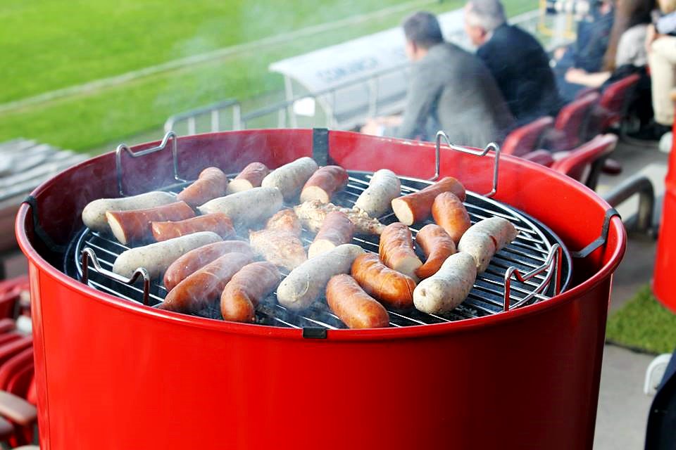 Wszyscy kibice chętnie kosztowali kiełbaski i inne potrawy z rusztu grilli węglowych. Zapach grillowanych potraw potęgował piłkarskie emocje.