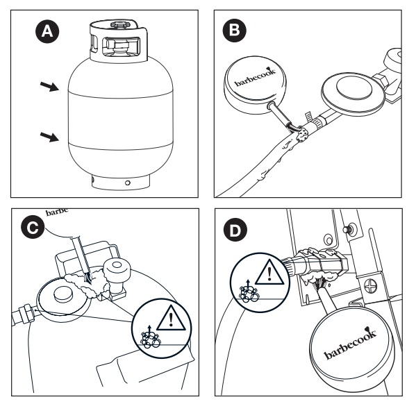 • Sprawdzenie połączeń gazowych i prawidłowości montażu palników.  Aby sprawdzić szczelność należy wykorzystać ciecz testową (można sporządzić z wody i płynu do naczyń w stosunku 1:1) i pędzelek załączony do zestawu startowego grilla