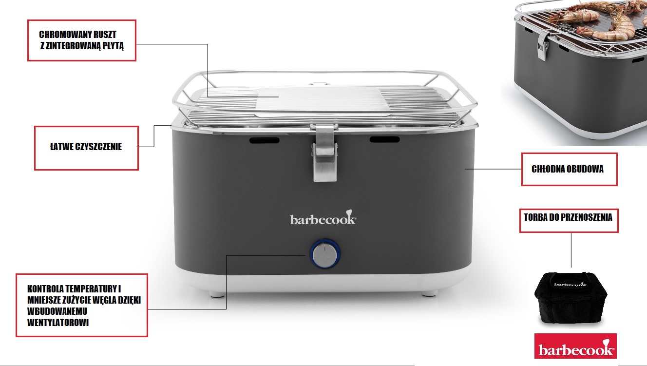 Grill węglowy Carlo Barbecook w nowym wydaniu w kolorze Urban Grey, posiada nowoczesny design oraz jest wyjątkowo praktyczny w użytkowaniu. Dzięki wbudowanemu wentylatorowi możliwa jest dokładna kontrola temperatury oraz osiąganie lepszych rezultatów, przy mniejszej ilości węgla. Konstrukcja grilla sprawia, że mimo wysokich temperatur na ruszcie, obudowa grilla pozostaje chłodna. Dodatkowo podczas grillowania praktycznie nie wydziela się dym, dzięki czemu możemy grillować praktycznie wszędzie.