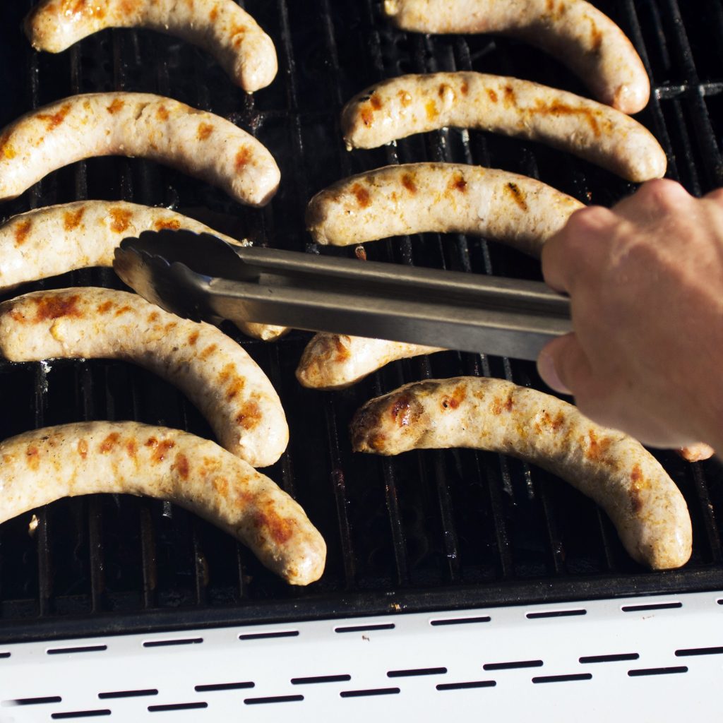 Kapustę drobno siekamy, podobnie jedną cebulę, następnie na tarce trzemy marchewki. Z przygotowancych warzyw, majonezu i jogurtu przygotowujemy sałatkę, którą doprawiamy do smaku solą i pieprzem oraz sokiem z cytryny. Grilla Siesta 310 rozgrzewamy i na rozgrzanym ruszcie umieszczamy kiełbaski. W międzyczasie na patelni na palniku bocznym podsmażamy cebulę.