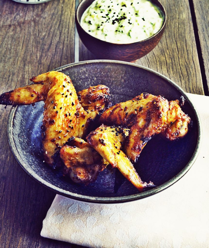 Przygotować marynatę z podanych składników krojąc bardzo drobno czosnek, imbir i szarotkę. Skrzydełka kurczaka przełożyć do miski i rozprwadzić dokładnie marynatę. Marynować w lodówce przez całą noc. Na rozgrzanym ruszcie ukłożyć posypane przyprawami skrzydełka. Co 10 minut obracać i smarować marynatą przy użyciu pędzla. Podawać z dipem na bazie jogurtu.