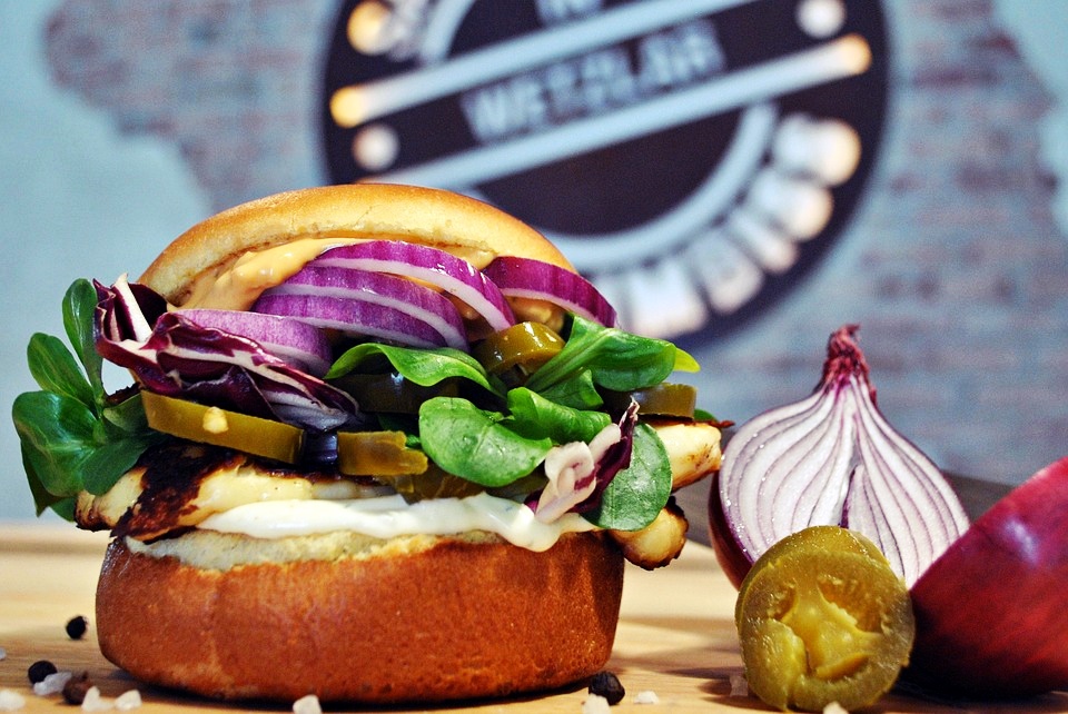Bułki przekrajamy na pól i wewnętrzną stroną układamy na płycie żeliwnej podsmażamy do zarumienienia. Ser halloumi kroimy na plastry i obtaczamy w oliwie, następnie grillujemy na płycie po ok. 4-5 min z każdej strony. Ser i pokrojone warzywa umieszczamy w bułce i polewamy ulubionymi sosami.